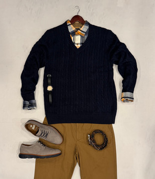 When I was designing this collection, I researched new Italian brands selling luxuriously soft cashmere sweaters with gorgeous weaves. I found cashmere ribbed socks in saturated colors. I gave him a mix of shirts with executive-level structured collars and patterns and fun orange and blue plaids. We completed the capsule with multicolored braided belts and suede oxfords, a blue and orange watch, and dress shirts with blue buttons. This is a small selection of some of the outfits we curated from his collection.